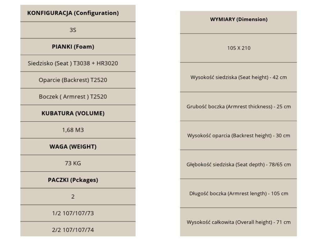 Stabilna konstrukcja o kubaturze 1,68 m³ i wadze 73 kg świadczy o solidnym wykonaniu i dbałości o szczegóły. Sofa dostarczana jest w dwóch paczkach, co ułatwia wnoszenie i ustawienie nawet w wąskich pomieszczeniach.