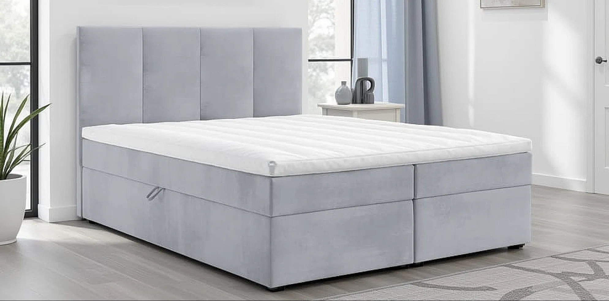 - Miękki, tapicerowany zagłówek – pionowe przeszycia nadają eleganckiego wyglądu i sprawiają, że łóżko świetnie prezentuje się w każdej sypialni.