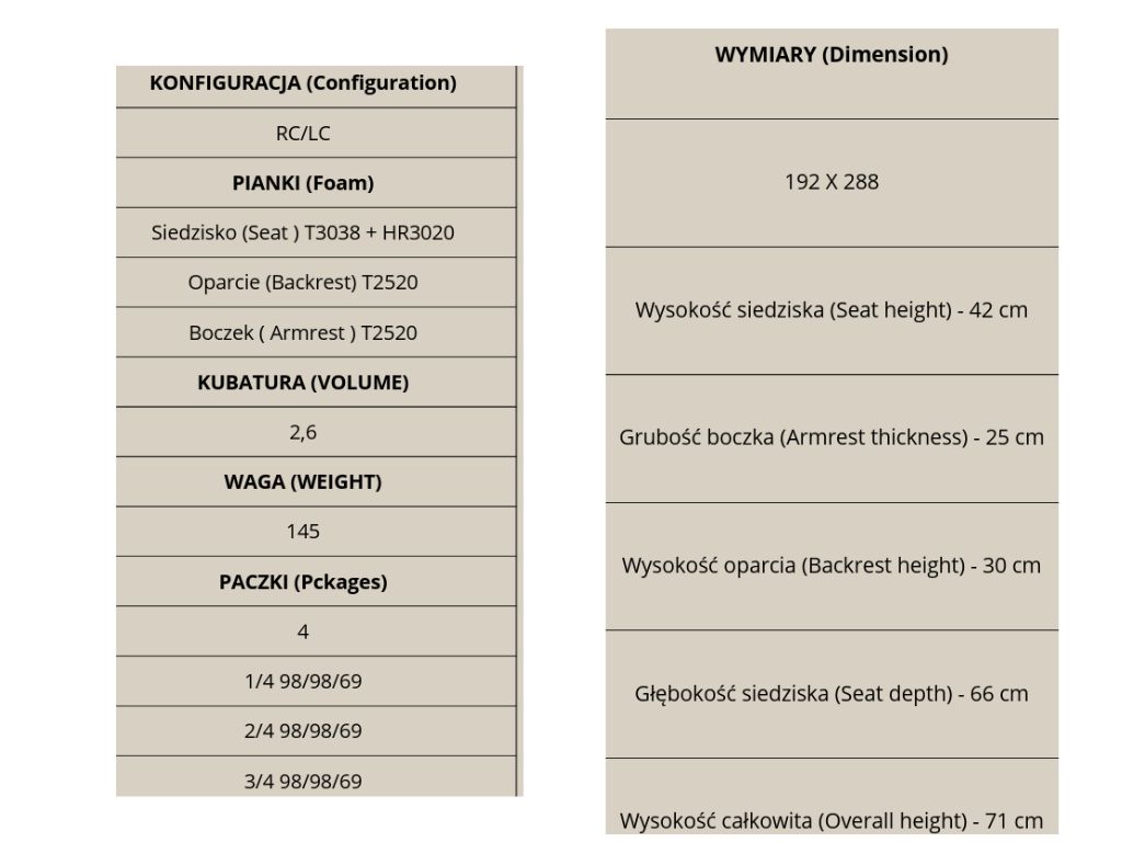 Siedzisko wypełnione piankami T3038 + HR3020 gwarantuje wyjątkową sprężystość, stabilność i odporność na odkształcenia. Oparcia i podłokietniki wykonano z pianki T2520, która oferuje miękkość i odpowiednie podparcie, zapewniając wysoki komfort nawet przy długim użytkowaniu. Głębokość siedziska 66 cm oraz wysokość 42 cm sprawiają, że narożnik doskonale dopasowuje się do naturalnej pozycji ciała.