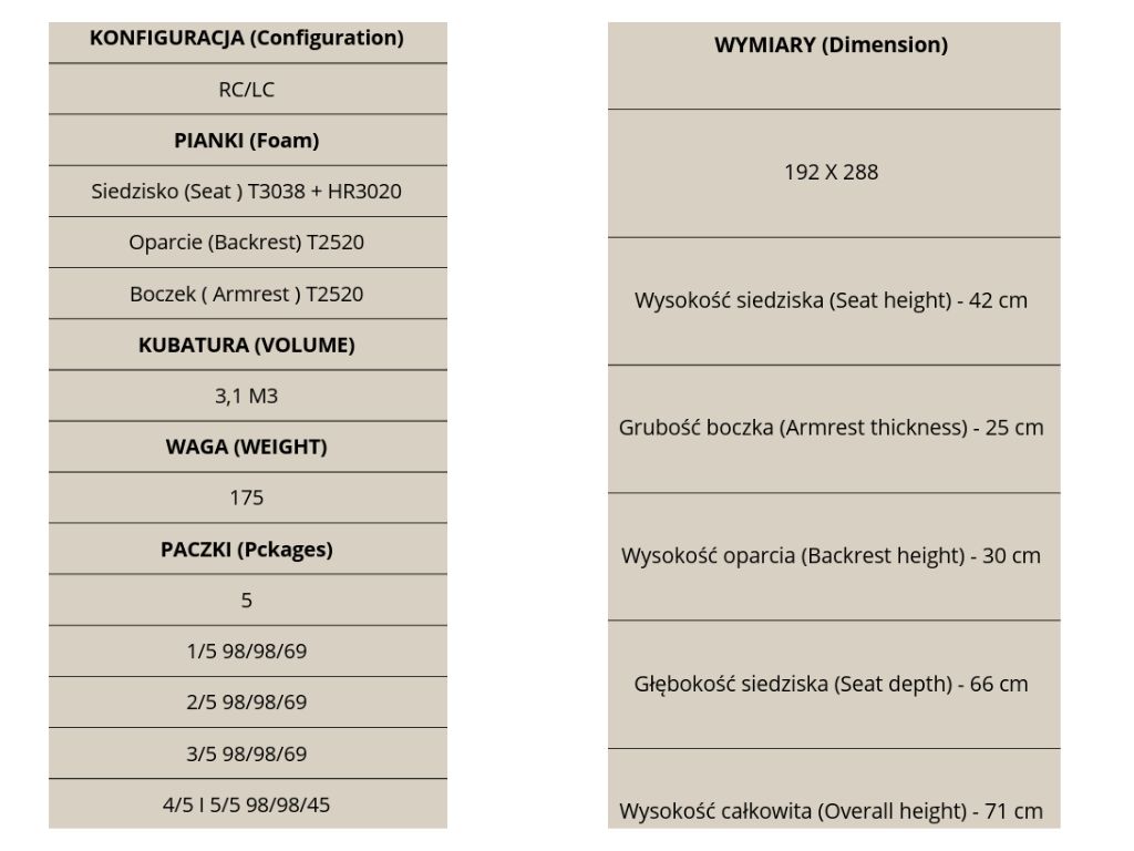 Siedziska wypełnione połączeniem pianek T3038 + HR3020 gwarantują sprężystość, elastyczność i odporność na odkształcenia. Oparcia oraz boczki wykonano z pianki T2520, zapewniającej odpowiednią miękkość i stabilne podparcie pleców. Głębokość siedziska 66 cm oraz wysokość 42 cm tworzą ergonomiczne warunki do długiego relaksu i komfortowego ułożenia ciała.