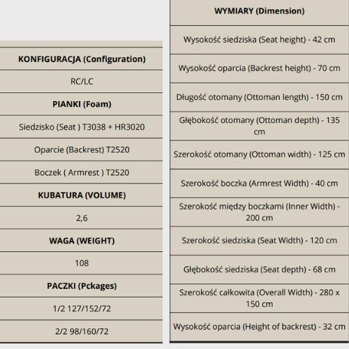 Głębokość siedziska 68 cm oraz wysokość siedziska 42 cm sprawiają, że narożnik oferuje ergonomiczne warunki do wypoczynku. Przestronna otomana o długości 150 cm pozwala wygodnie wyprostować nogi i stworzyć idealną strefę relaksu.