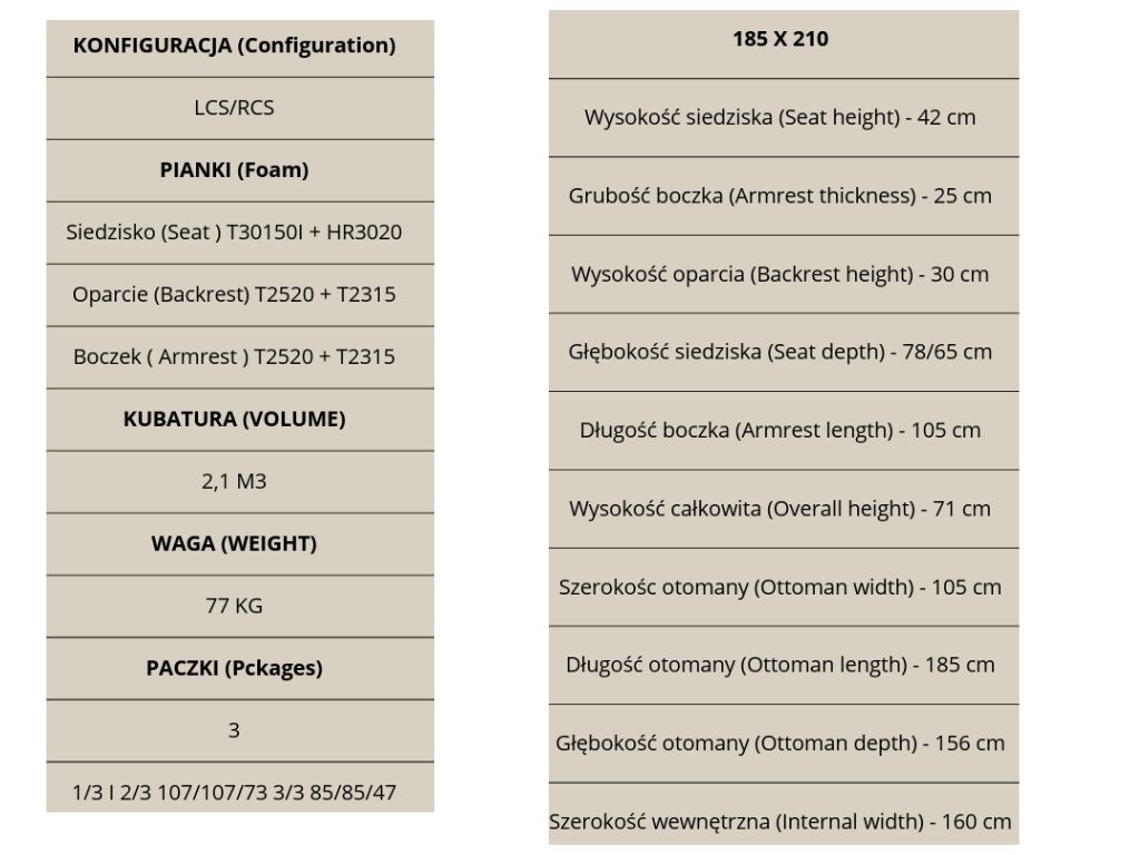Duża ottomana o wymiarach 185 × 156 × 105 cm tworzy przestrzeń idealną do wypoczynku w pozycji leżącej lub półleżącej. Wewnętrzna szerokość narożnika 160 cm sprawia, że nawet kilka osób może komfortowo spędzać czas w salonie. Konstrukcja o kubaturze 2,1 m³ i wadze 77 kg zapewnia stabilność, solidność oraz długotrwałą wytrzymałość mebla.