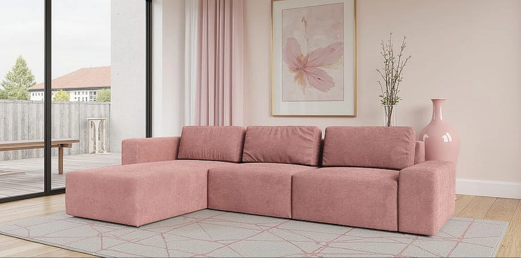 Obicie z miękkiej i wyjątkowo modnej tkaniny bouclé wprowadza do wnętrza przytulność i teksturalne bogactwo. Trwały stelaż z drewna i płyty wiórowej, wysokoelastyczna pianka HR oraz poduszki wypełnione włóknem silikonowym gwarantują trwałość i niezrównany komfort użytkowania przez długie lata.