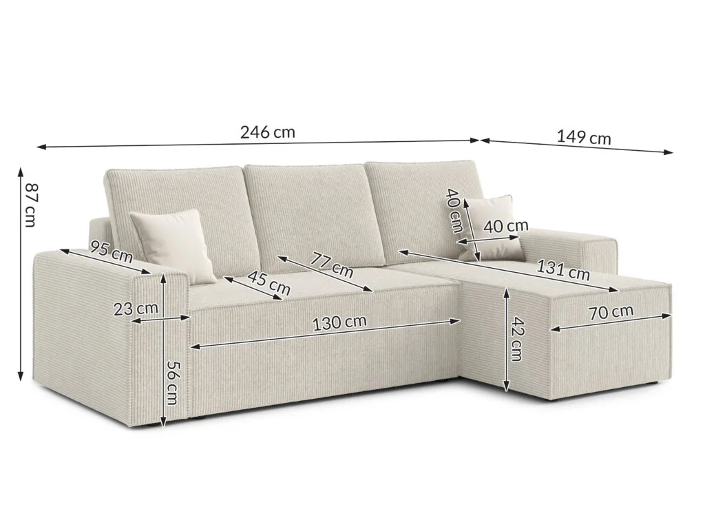 Poznaj naszą nowość – narożnik VARENO, który łączy klasyczną formę z modnym akcentem w postaci sztruksowej tkaniny. Materiał ten, wracający do wnętrzarskich trendów, dodaje meblowi ciepła i wyjątkowego charakteru. W zestawie znajdziesz dwie dekoracyjne poduszki typu jasiek wykonane z miękkiego welwetu – to stylowy dodatek i komfortowy detal w jednym.