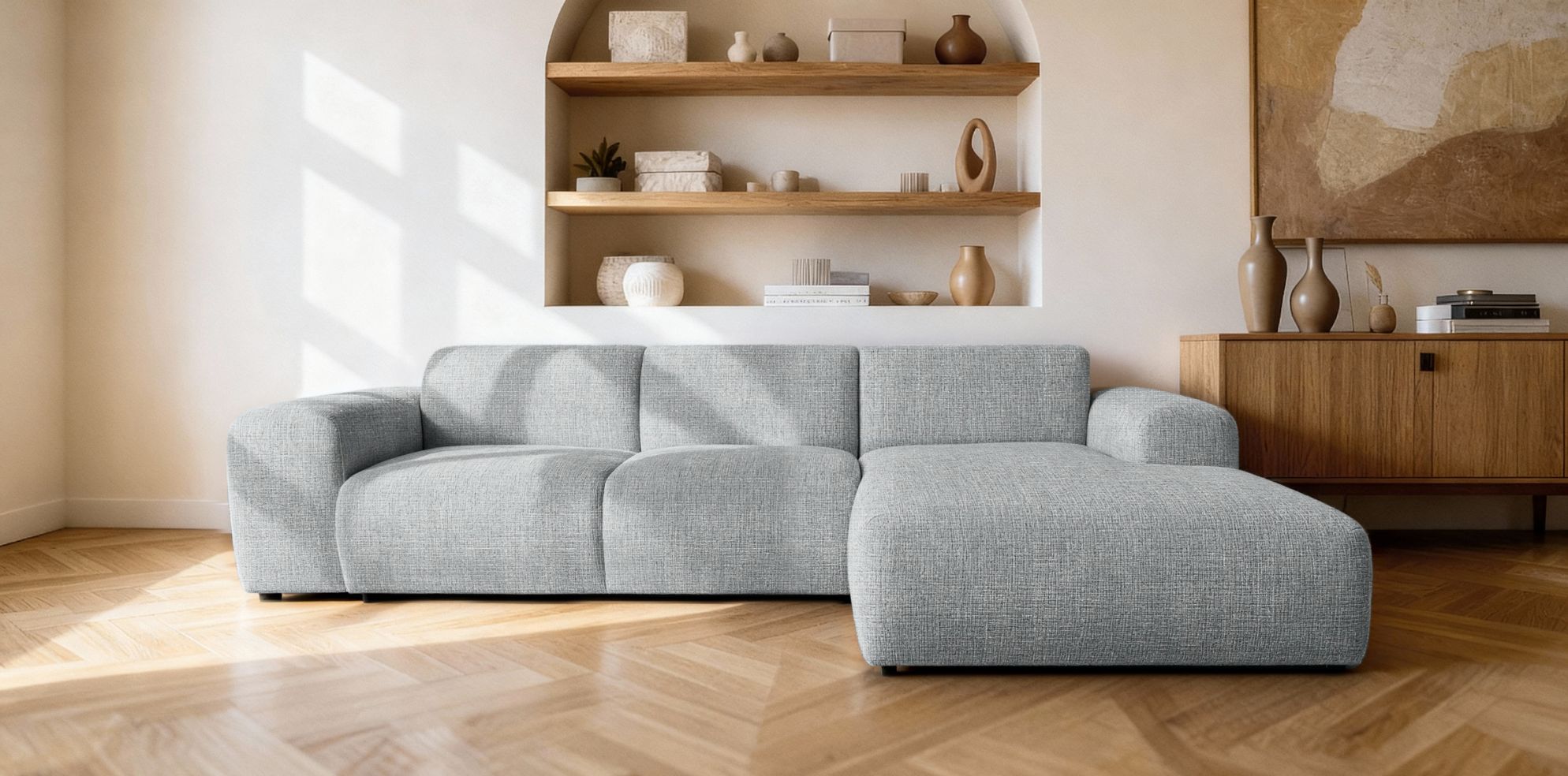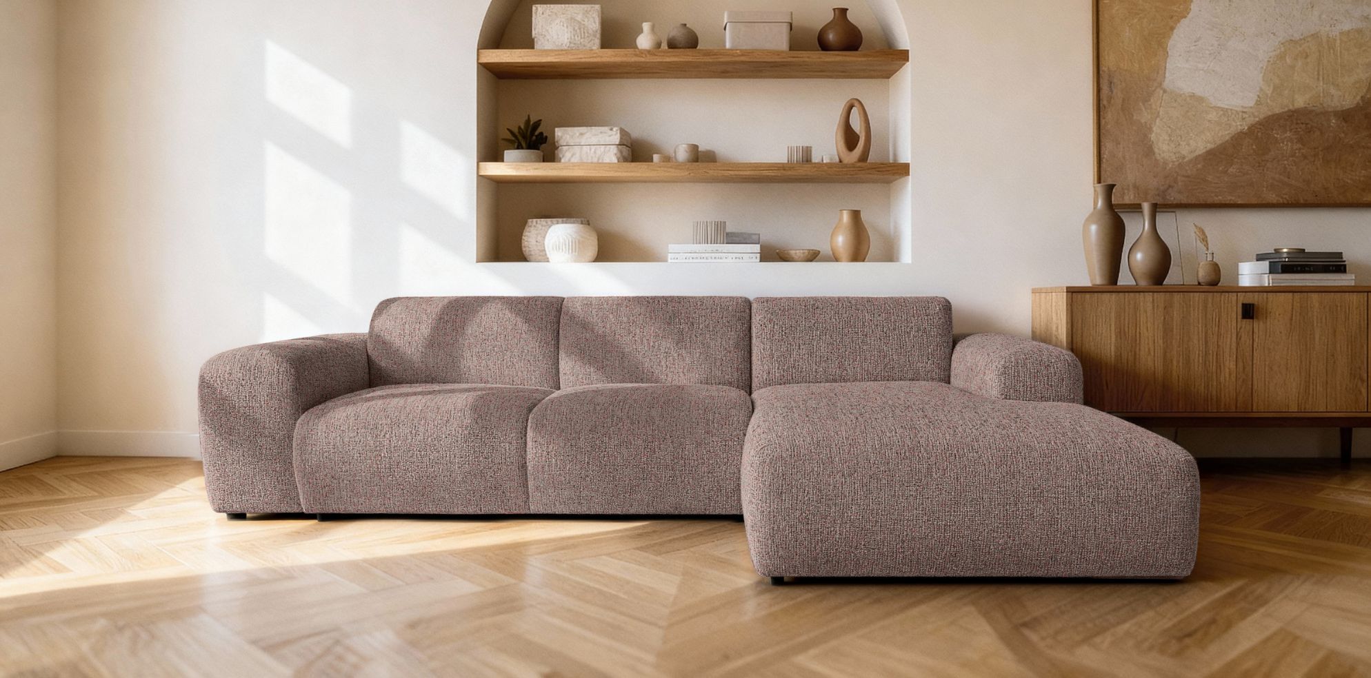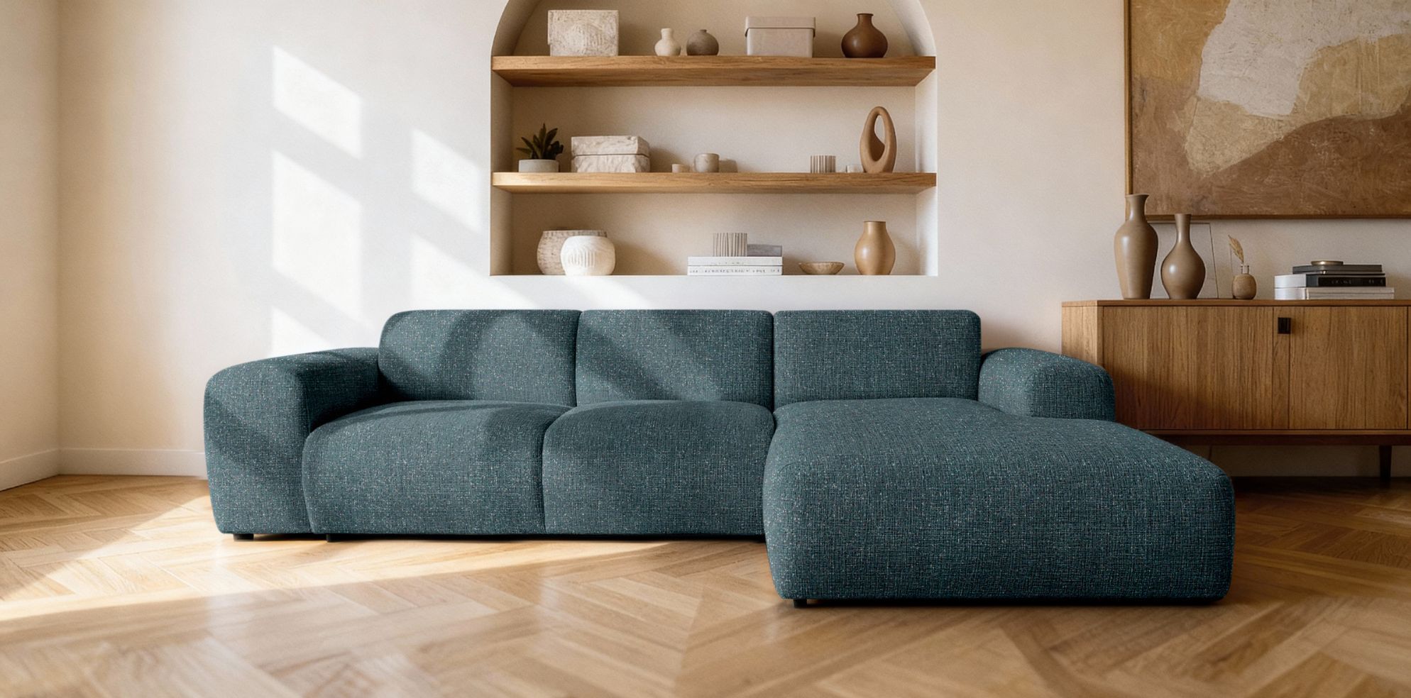 Model dostępny jest w konfiguracji RC lub LC, co pozwala dopasować ustawienie narożnika do układu pomieszczenia. Dzięki temu sprawdzi się zarówno w dużych salonach, jak i w przestronnych strefach wypoczynkowych.