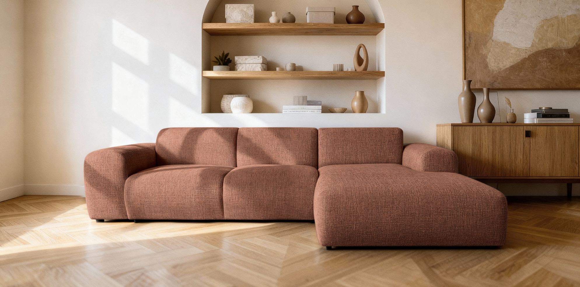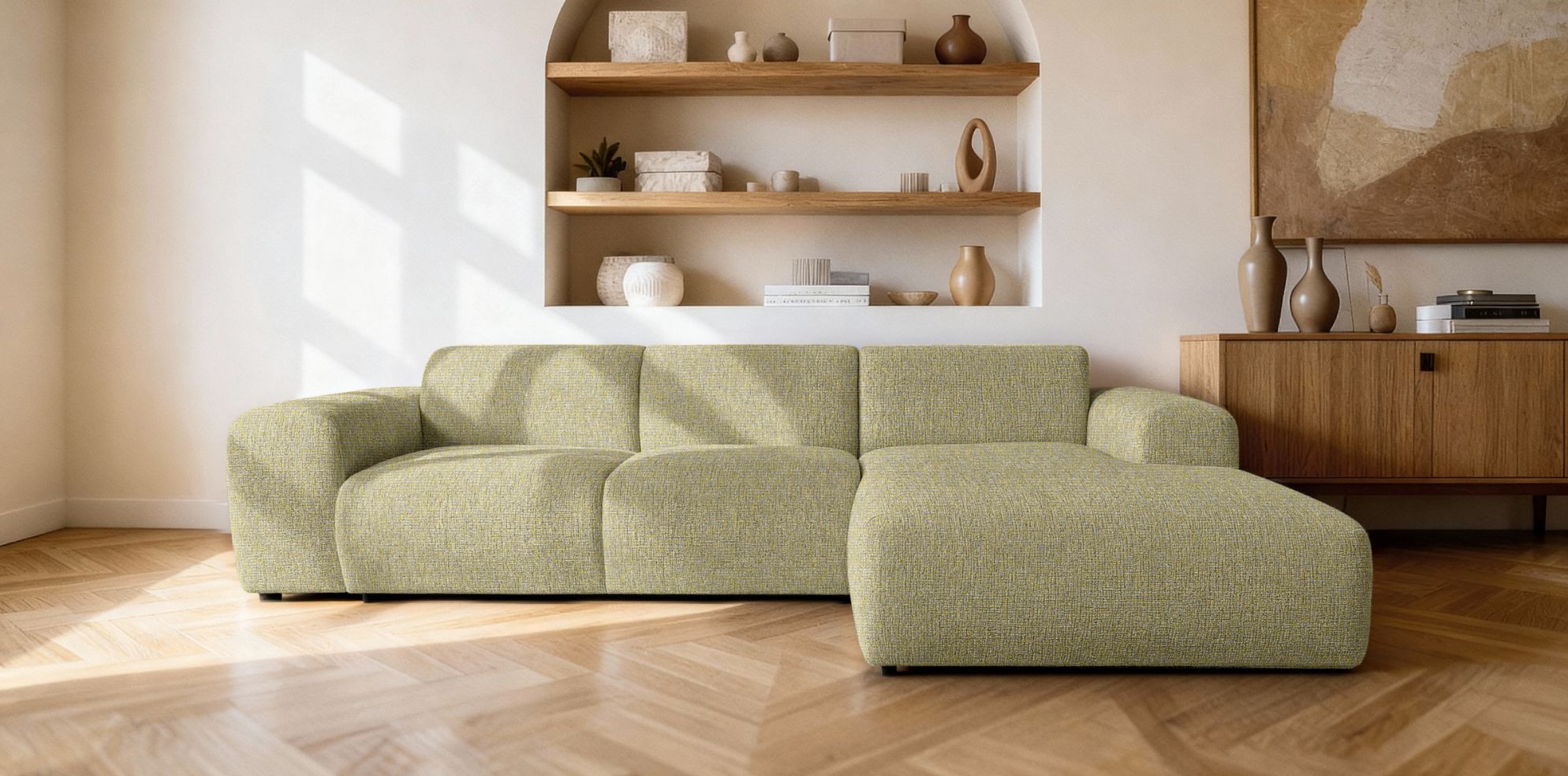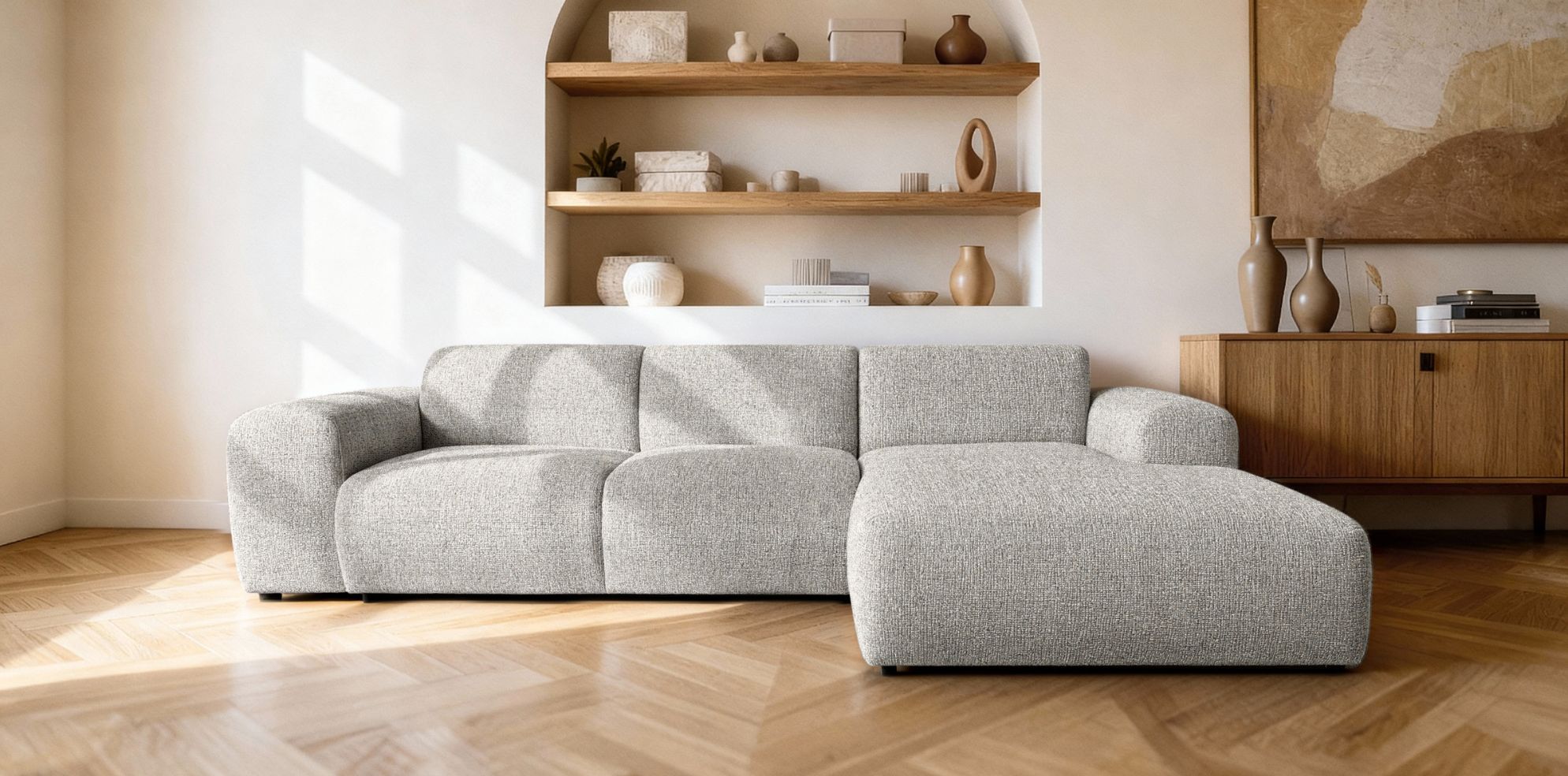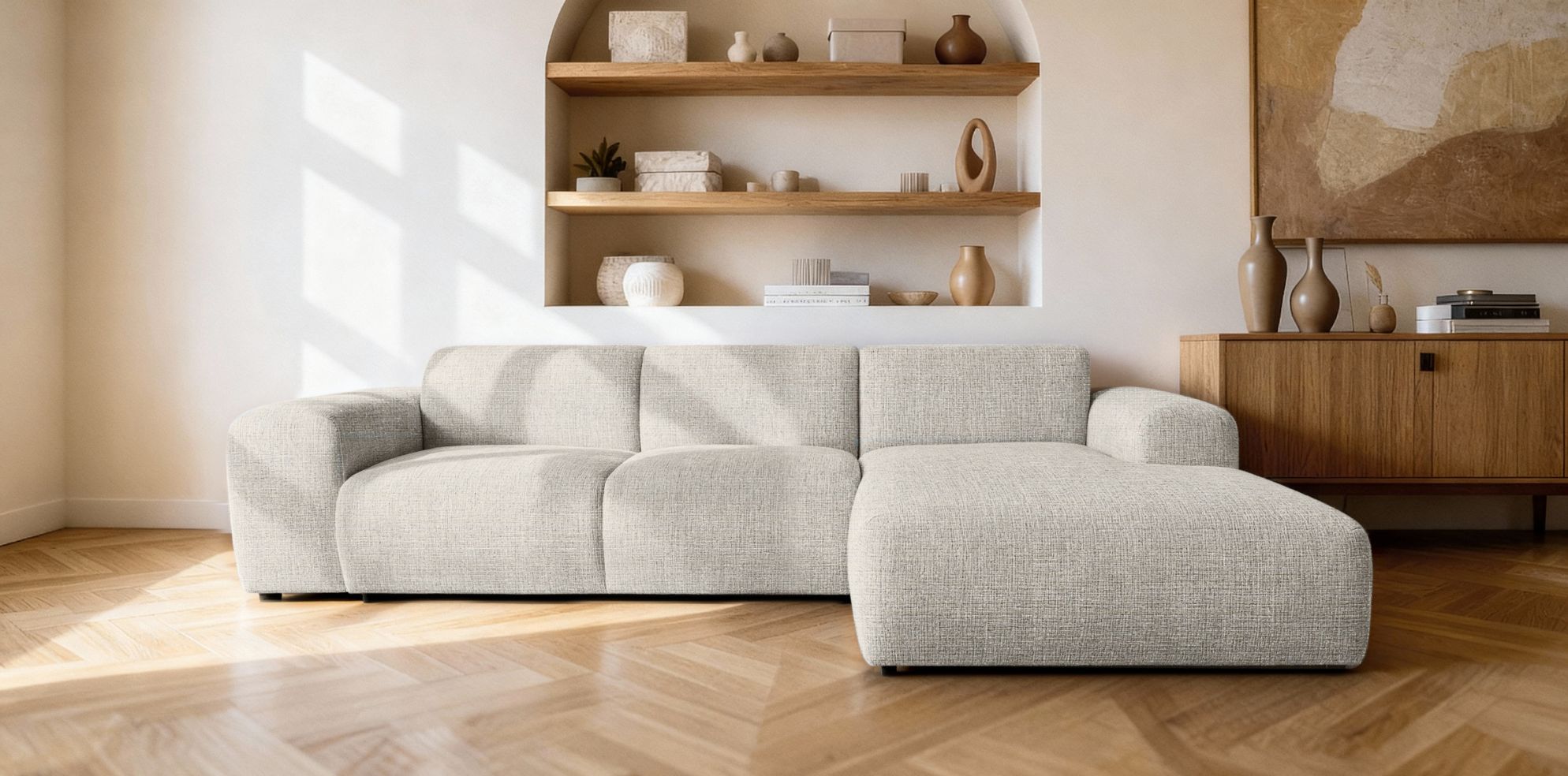 Model dostępny jest w konfiguracji RC lub LC, co pozwala dopasować ustawienie narożnika do układu pomieszczenia. Dzięki temu sprawdzi się zarówno w dużych salonach, jak i w przestronnych strefach wypoczynkowych.