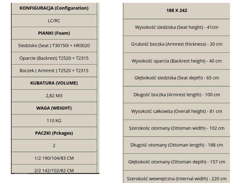 W siedzisku zastosowano połączenie wysokiej jakości pianek T30150I + HR3020, które gwarantują sprężystość, trwałość oraz odporność na odkształcenia. Oparcia i boczki wykonane z pianek T2520 + T2315 zapewniają miękkie i wygodne podparcie, podnosząc komfort codziennego użytkowania. Głębokość siedziska 65 cm i wysokość 41 cm tworzą ergonomiczne warunki do wypoczynku.