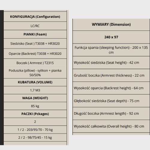 Ergonomiczne proporcje – wysokość siedziska 42 cm oraz głębokość 75 cm – zapewniają komfortową pozycję podczas relaksu. Stabilna konstrukcja o wadze 85 kg gwarantuje trwałość i solidność mebla przez wiele lat użytkowania.